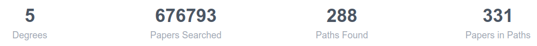 The search found 288 paths of degree 5 which travel through 331 papers and searched through ~676k papers in the process. For more info on what all of these mean head over to the Literature Connector Explained page.
